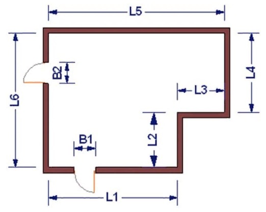 - В первую очередь важно определить площадь помещения, указав её в квадратных метрах. Для этого необходимо перемножить между собой длину и ширину помещения. В случае, если речь идёт о комнате неправильной формы, её предварительно разбивают на несколько прямоугольников и высчитать итоговую площадь каждого сегмента, а всю площадь сложить.